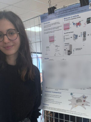 Les lymphocytes B sont des cellules du système immunitaire, en charge de produire des anticorps pour défendre l’organisme. Dans la leucémie lymphoïde chronique (LLC), les lymphocytes B tumoraux s’accumulent particulièrement dans les ganglions lymphatiques et la moelle osseuse. Quand purifié du sang des patients, ces cellules B de LLC meurent rapidement. Mais leur survie augmente lorsqu’elles sont entourées d’autres cellules qui produisent des molécules qui favorisent leur prolifération. Ces cellules non tumorales définissent le microenvironnement. Les cellules de LLC modifient ce microenvironnement à leur avantage. Notre projet porte sur l’étude des modifications des cellules du microenvironnement par contact avec les cellules B de LLC. En effet, après contact avec des B de LLC, les cellules du microenvironnement changent d’aspect : elles deviennent plus rondes. Cette forme ronde est souvent associée à une plus grande souplesse de l’architecture du tissu, favorisant davantage l’accumulation des cellules tumorales.